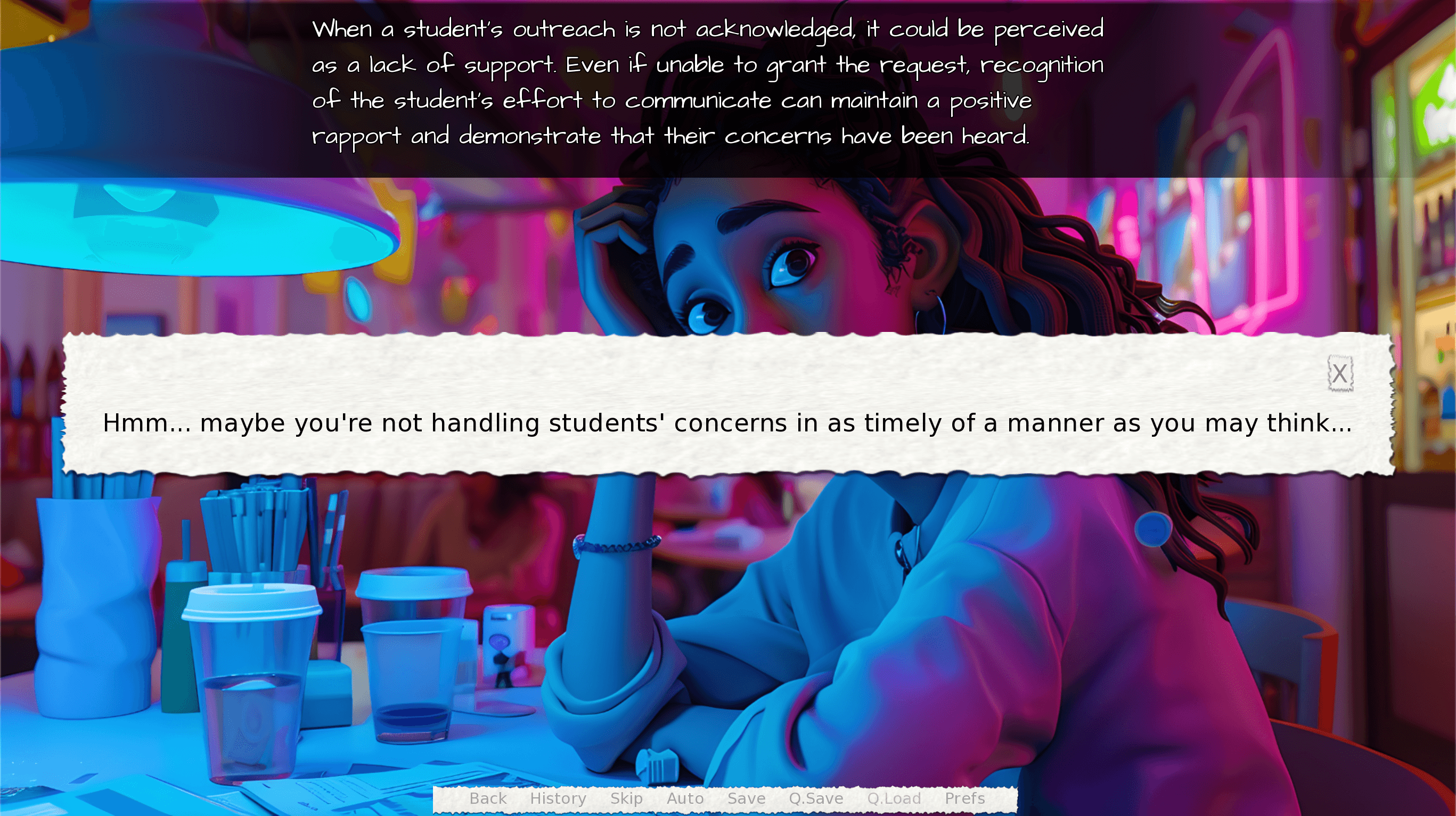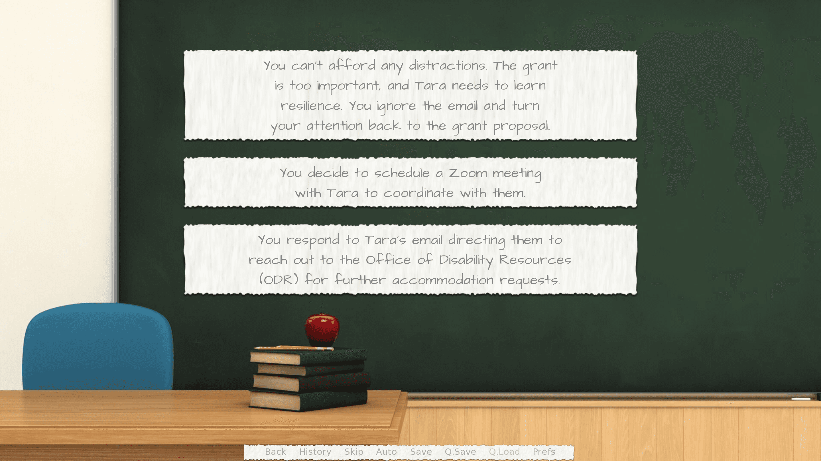Consequence: Every choice led to a consequence, mirroring the real-world impact of faculty decisions on students like Tara. By experiencing the outcomes of their decisions, faculty could understand the effects of their actions without the real-world risks. This helped to deepen their empathy and awareness of how even small decisions can significantly impact a student's well-being.